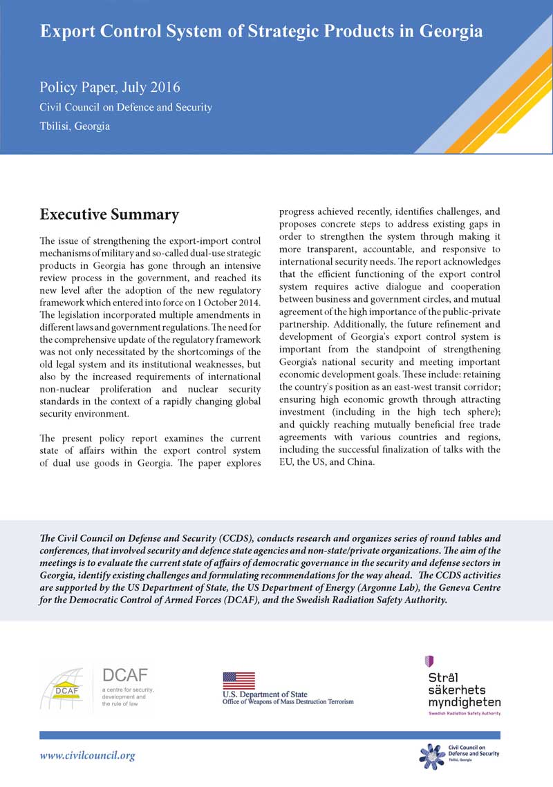 The issue of strengthening the export-import control mechanisms of military and so-called dual-use strategic products in Georgia has gone through an intensive review process in the government, and reached its new level aft e r the adoption o f t he n ew r egulatory framework which entered into force on 1 October 2014. Th e legislation incorporated multiple amendments in diff erent laws and government regulations. Th e need for the comprehensive update of the regulatory framework was not only necessitated by the shortcomings of the old legal system and its institutional weaknesses, but also by the increased interest of international community to promote nuclear nonproliferation and nuclear security standards in the context of a rapidly changing global security environment.